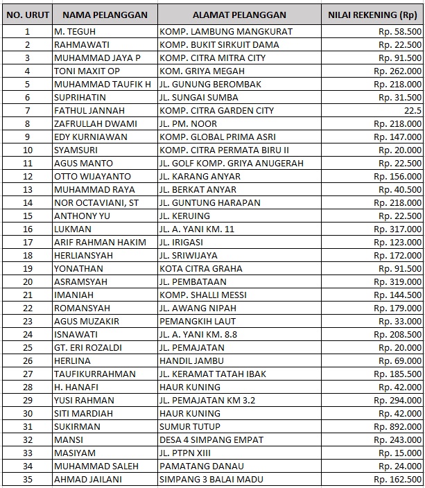Berdasarkan rekapitulasi periode Februari 2025, tercatat sebanyak 35 pelanggan menerima manfaat program rekening air gratis dengan total nilai rekening yang dibayarkan perusahaan mencapai Rp5.119.500. Selain itu, perusahaan juga memberikan diskon program deposit satu tahun kepada 6 pelanggan, dengan total nilai diskon sebesar Rp282.608.