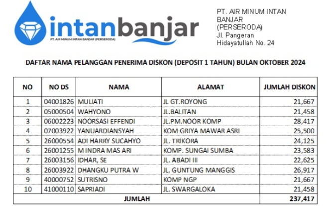 Program deposit tentunya ini membantu pelanggan yang suka bepergian untuk tetap merasa aman dan otomatis terhindar dari denda, selain juga memberikan insentif khusus dari PTAM Intan Banjar. Program ini bisa diikuti semua pelanggan, baik itu sosial, rumah tangga bahkan bisnis atau niaga. Seperti berkesempatan mendapatkan reward bulanan maupun tahunan. Untuk informasi lebih lanjut, silakan hubungi PTAM Intan Banjar.