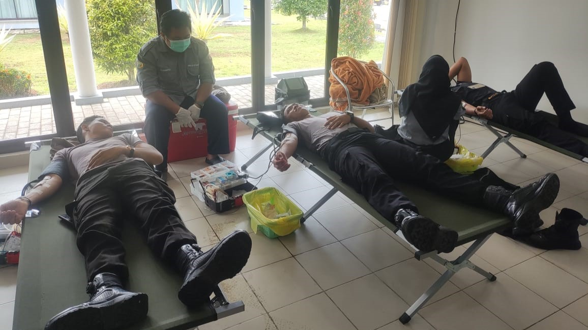 Samapta Polres Kotabaru ikut dalam kegiatan donor darah yang digelar di PT SDGI, Kabupaten Kotabaru, Senin (13/01/2025).